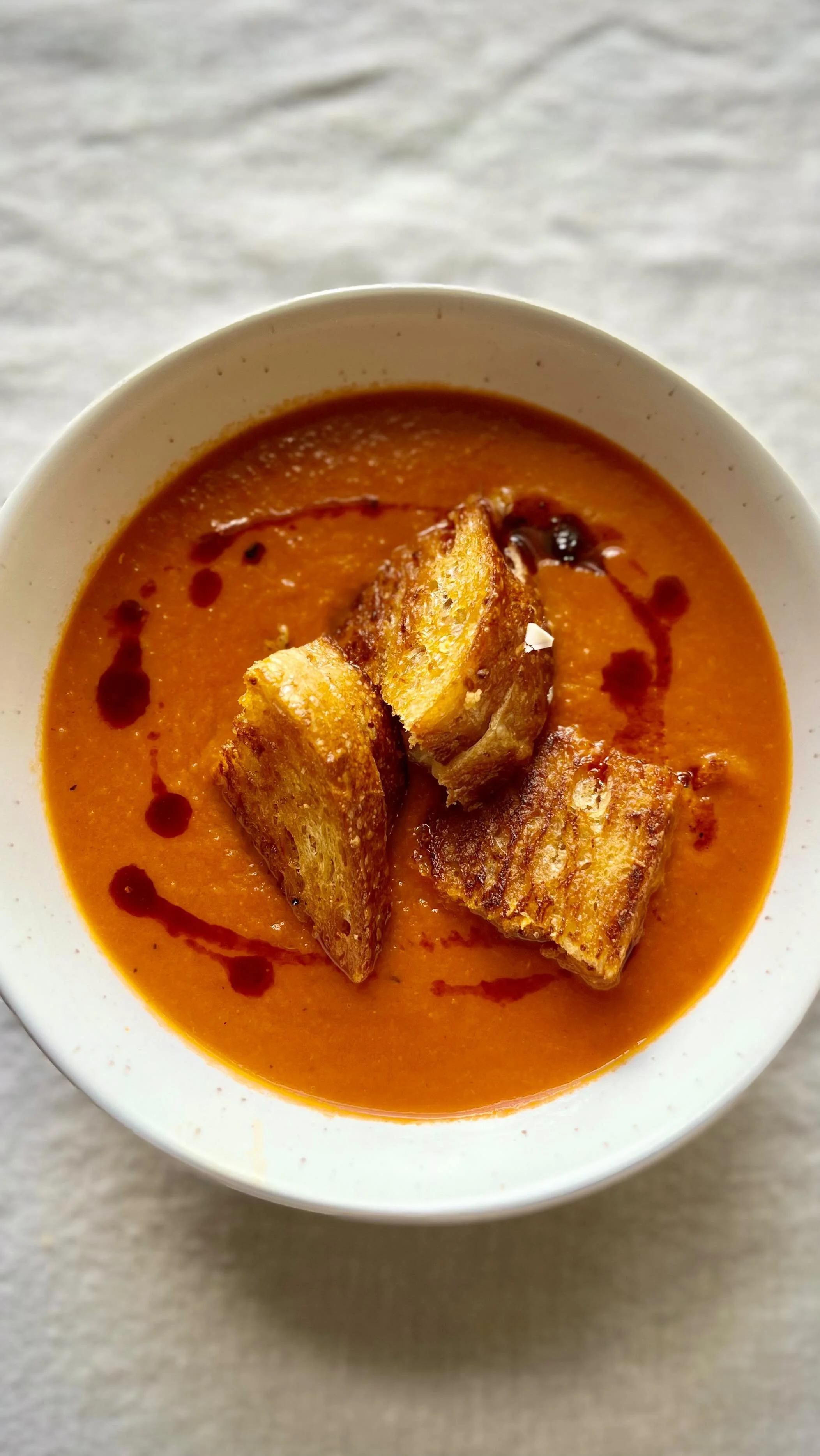 Tomato Soup with Chili Crisp Grilled Cheese Bites